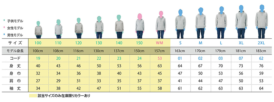 | ※子供用衣類の安全性を図る為、100cm~150cmにはフードのひもはついていません。 ※一部本体カラーは在庫限り | |