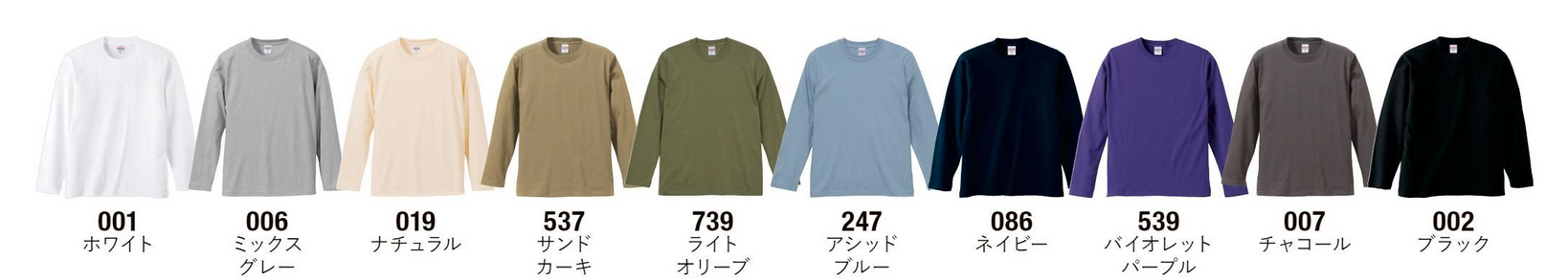 | 製品情報 | 5001 ハイクオリティ綿Tシャツと同生地を使用した、ロングスリーブタイプ。 袖口はリブなし。 普段づかいには重ね着でインナーにしたり、チーム・グループでおそろいウェアを作ったり、一年を通して着用できる定番のロングスリーブです。 |