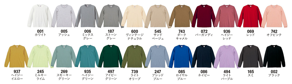 | 製品情報 | 5001 ハイクオリティ綿Tシャツと同生地を使用した、ロングスリーブタイプ。 普段づかいには重ね着でインナーにしたり、チーム・グループでおそろいウェアを作ったり、一年を通して着用できる定番のロングスリーブです。 約4cmの袖口リブは適度な弾力があります。 |